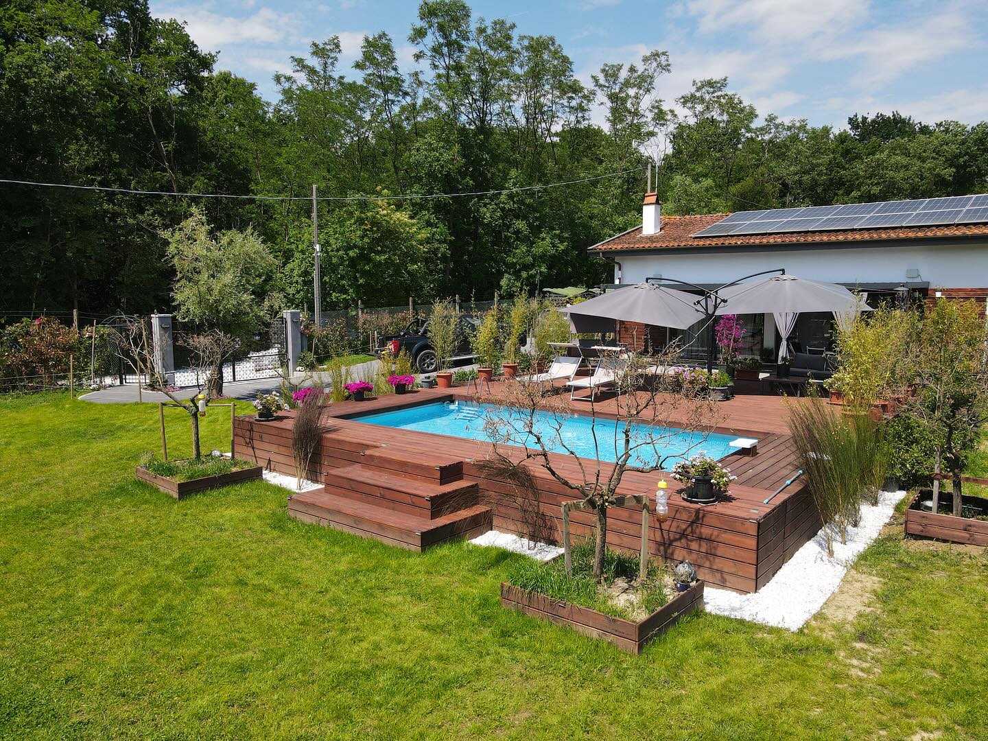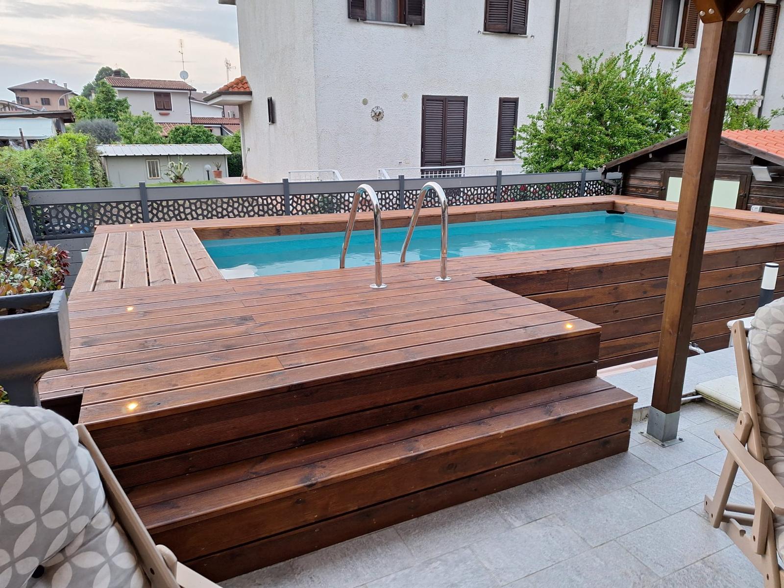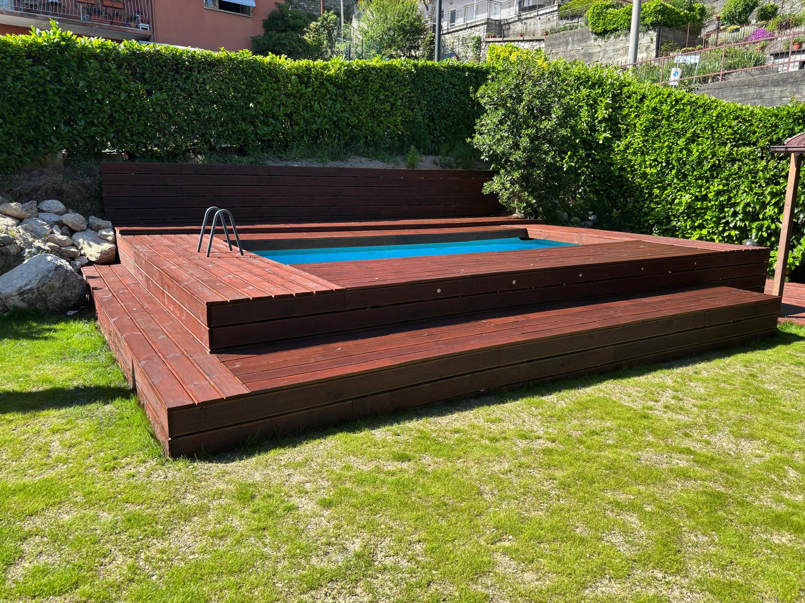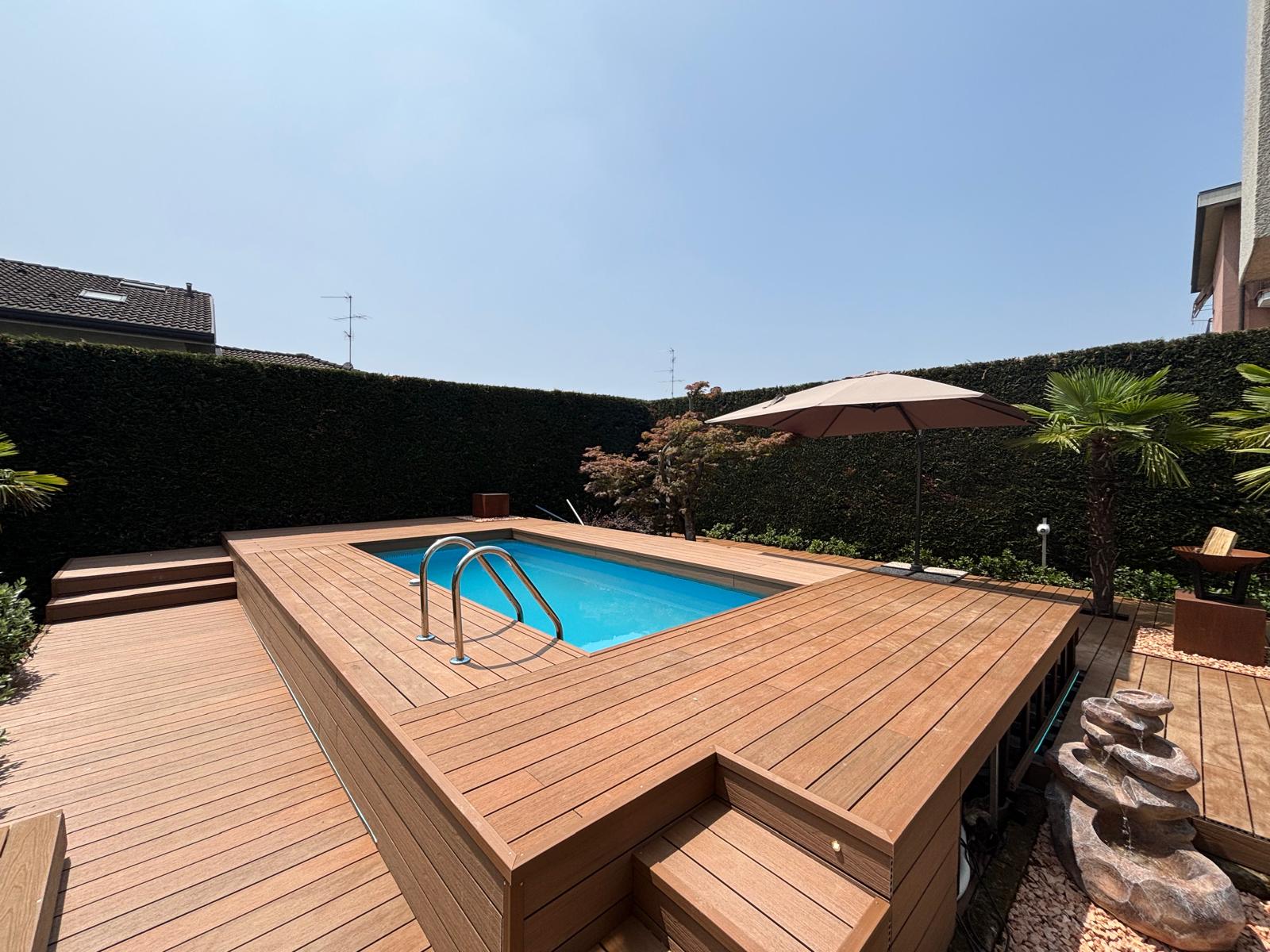 Rivestila in legno con i moduli Yourwood! Rendila elegante e funzionale creando solarium e nuovi spazi a bordo piscina, proprio come una piscina interrata!